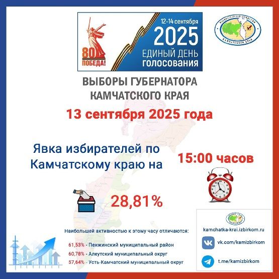 Активность избирателей на выборах Губернатора Камчатского края по состоянию на 15:00 часов 13 сентября 2025 года составила 28,81 %.