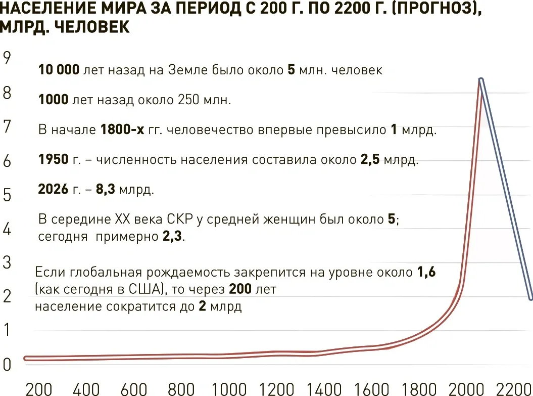 Хотя еще недавно опасались, что будет и 15 и даже 20 миллиардов, опасались, что не хватит ресурсов. А теперь дружно заговорили про сокращение. Все же почему? Ведь именно новые технологии открывают возможности плодиться без особого ущерба экосистемам?Альберт Бахтизин: Вопросы демографии одни из самых сложных, так как зависят от множества самых разных, порой взаимоисключающих факторов. Поэтому здесь однозначных ответов нет, но есть немало интересных точек зрения. Например, демографическим бестселлером 2025 года стала книга "После пика", которую написали Дин Спирс и Майкл Герусо. Авторы утверждают, что нынешняя численность населения Земли совершенно аномальна. Особо подчеркивают, что этот скачок произошел исторически в кратчайший момент времени. Еще 200 лет назад на планете жил миллиард человек, в 1950 году всего 2,5 миллиарда, а за каких-то 75 лет стало в 3,3 раза больше. Фантастический прирост!