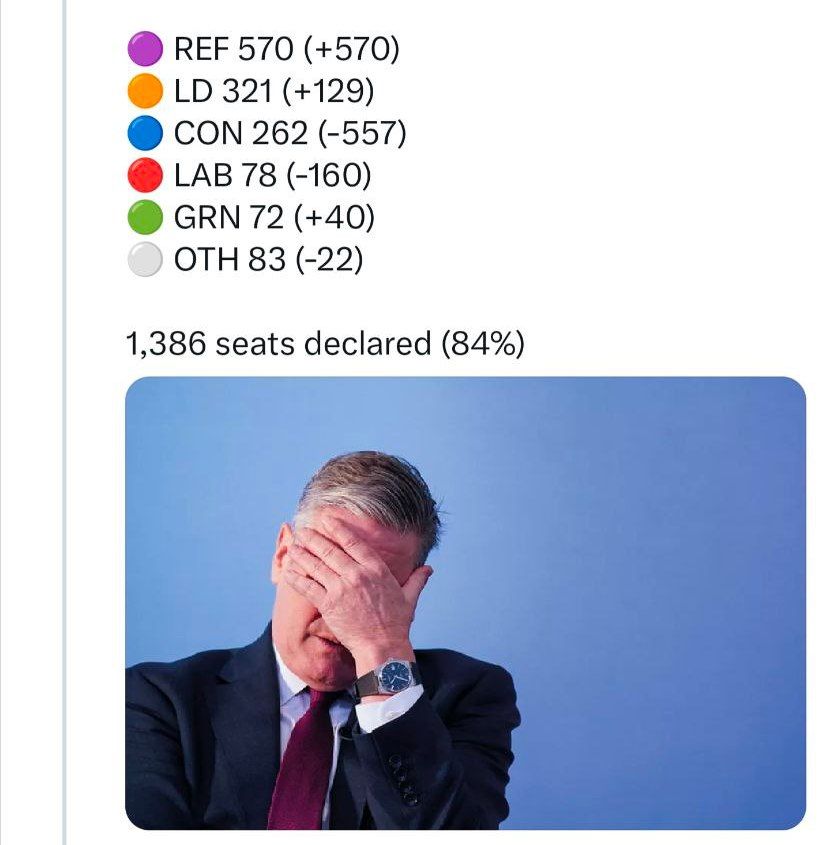 Результаты продолжают приходить, и кажется, что это третий погром консервативной партии после местных выборов-2023 и общенациональных-2024,