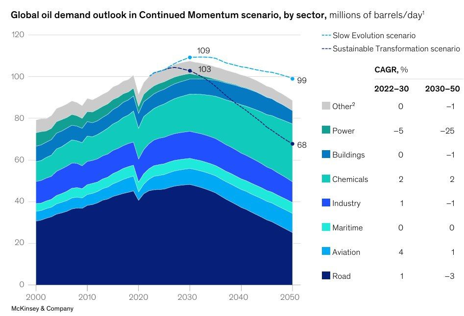Экономический обозреватель журнала «Монокль», ведущий канала «Графономика», эксперт Центра ПРИСП Евгений Огородников - о прогнозах мирового потребления нефти.Это похоже на «заговор» аналитиков по мировой энергетике. На графике — прогноз потребления нефти от McKinsey до середины века. Согласно видению независимого и уважаемого агентства, мировое потребление достигнет пика в 2030 году на уровне 109 млн барр. в сутки, а потом пойдёт вниз. Во всех сценариях отличается только скорость этого снижения.