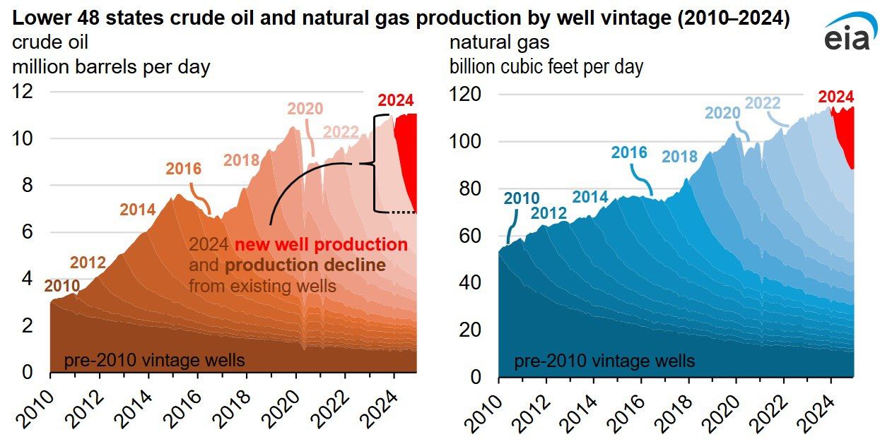 4,3 млн баррелей в сутки новой нефти — просто чтобы компенсировать убывающую добычу на старых скважинах! Ещё раз: американскому нефтегазовому сектору необходимо воссоздавать китайский или канадский нефтепром каждый год! Не пробурил — и качаешь 15-20-30 лет, как в Сибири или Саудовской Аравии, а здесь «бури, детка, бури, бури, бури, бури...», чтобы добыча просто не падала.