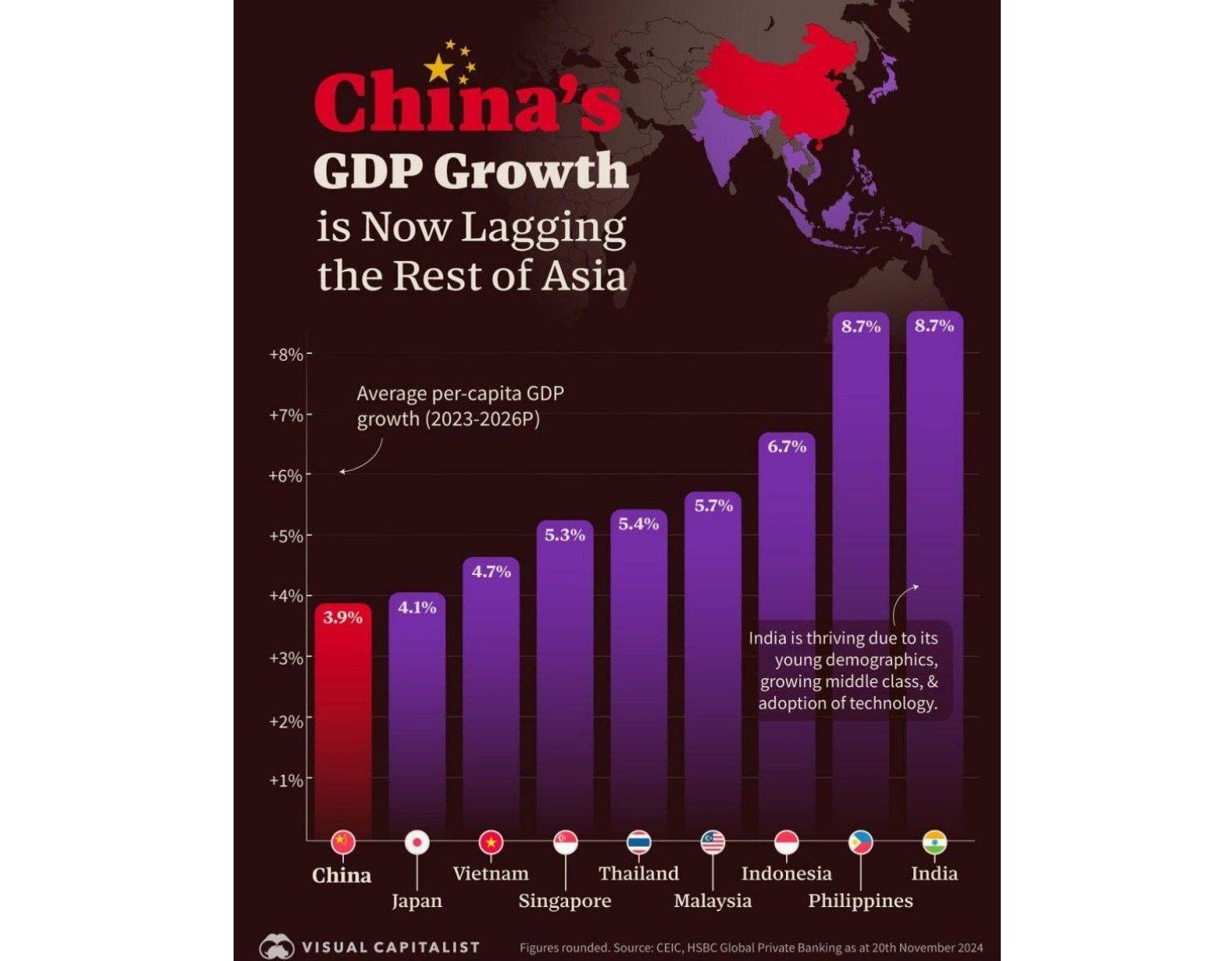Тем не менее само изменение знаковое: десятилетиями Китай выступал локомотивом развития всей Азии, а с какого-то момента — и драйвером роста мирового ВВП. Но прямо сейчас это уходит в прошлое. Китай — это уже не лидер экономического развития. Намного быстрее подушевой ВВП растёт в Индии, Филиппинах, Индонезии и Вьетнаме. И эти страны густонаселённые, а их экономики уже далеко не микроскопические. Они начинают играть всё большую роль и в регионе, и в мире.