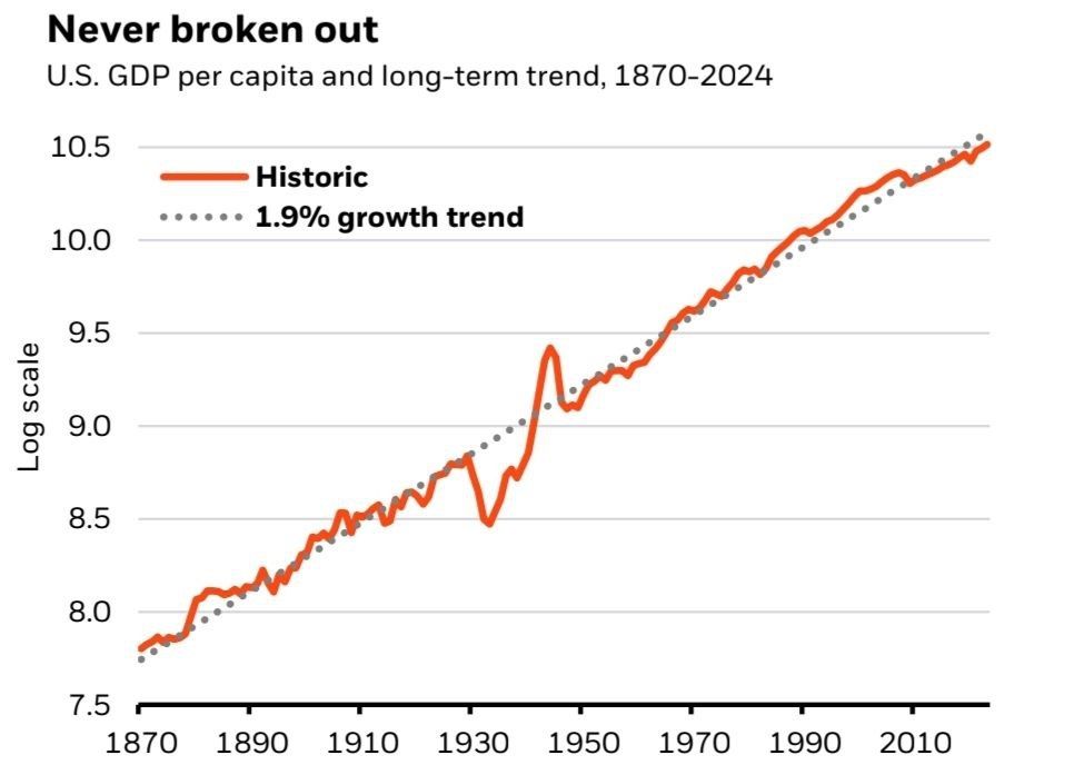 Экономический обозреватель журнала «Монокль», ведущий канала «Графономика», эксперт Центра ПРИСП Евгений Огородников – о проблемах с реальным ростом ВВП США.Что-то разбилось в Штатах в 2008 году, и все попытки склеить и собрать это «что-то» пока не увенчались успехом. На графике видно, как реальный рост ВВП сильно отстал от долгосрочного 150-летнего тренда. Казалось бы в рамках обычных многолетних флуктуаций, но нет: прирост ВВП в последние 15 лет происходит за счёт безудержных трат Минфина. Однако даже ежегодные вливания по 2 трлн долларов от дяди Сэма не могут вернуть экономику к нормальной траектории роста, и отклонения накапливаются каждый год.
