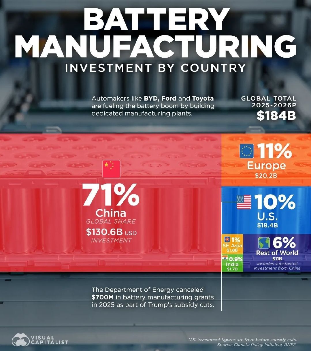 На инфографике выше — объёмы инвестиций в строительство гигафабрик: заводов производящих аккумуляторы. На Китай приходится 70 % мировых вложений в 2025–2026 годах. И это даёт свой эффект. Весь мир пользуется китайскими аккумуляторами. Пусть не готовыми изделиями — многие компании строят заводы в США и Европе, но часть компонентов американских и европейских аккумуляторов обязательно будет закуплена в КНР.